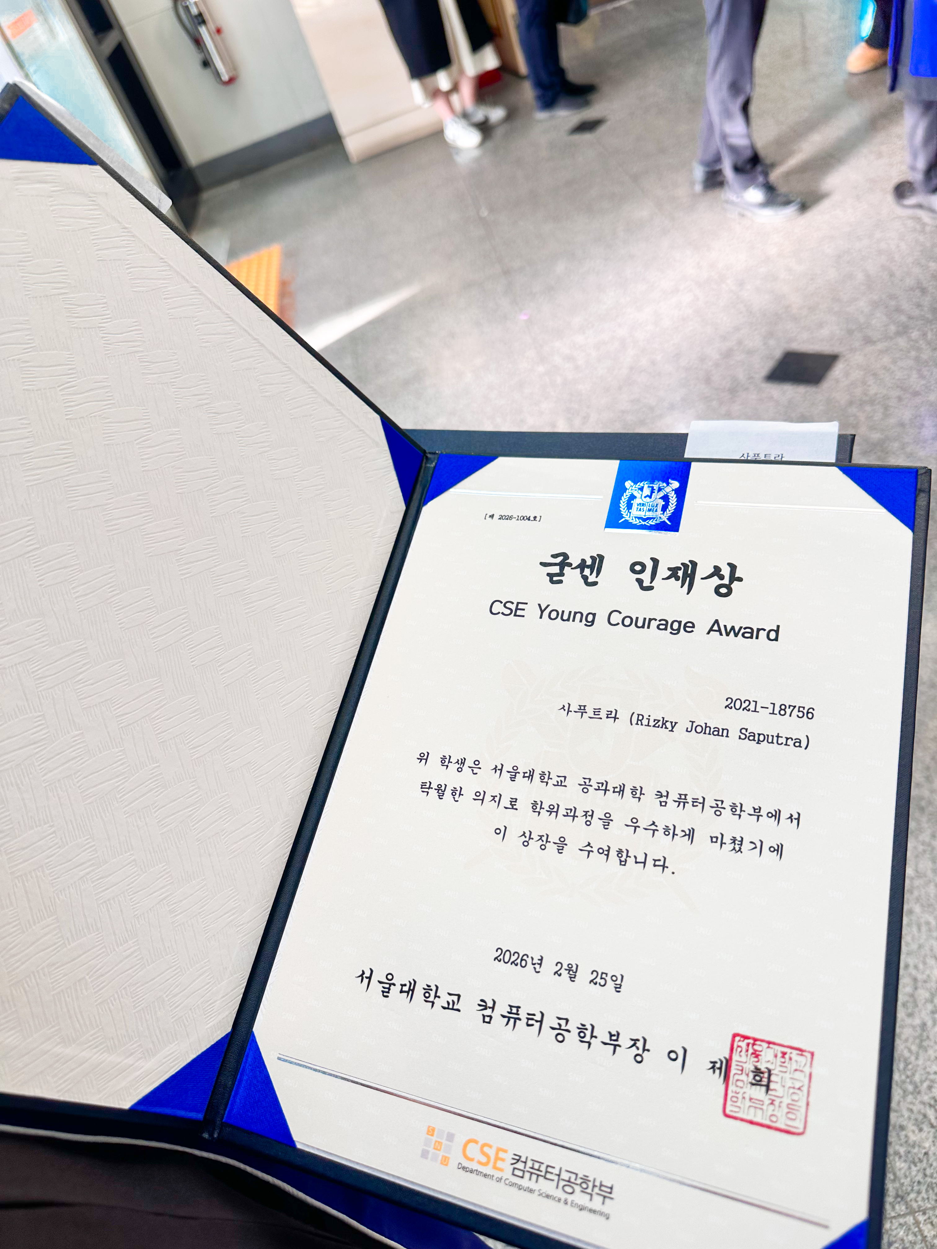 During my time as an undergraduate student at Seoul National University, I actively involved myself in coursework, projects, and discussions whenever possible. In cases of emergency, I decided to step up as a leader of the team and I valued the importance of collaboration and communication. I always believed that learning should not be passive and that curiosity combined with hard work creates the most optimal environment for growth. As a result of this dedication, I was honored to receive the CSE Young Courage Award, which recognizes students for their hard work, creativity, and active engagement in both academic and non-academic activities such as projects and events. This award represents more than recognition as it symbolizes the perseverance required to continue pushing forward even when the path is uncertain. Consequently, the graduation ceremony has made me realized of how my dedication and discipline throughout the years have brought a fruitful outcome that I never expected I could achieve in the first place. Therefore, this will not be the last time that you will hear from me as I know that I can do and achieve even better things in the future despite the trials and hardships, as I have proven from time to time that as long as dedication is filled with discipline, nothing can ever stop anyone to achieve what they wanted to be in life. With this message, I wanted to say thank you and veritas lux mea!
